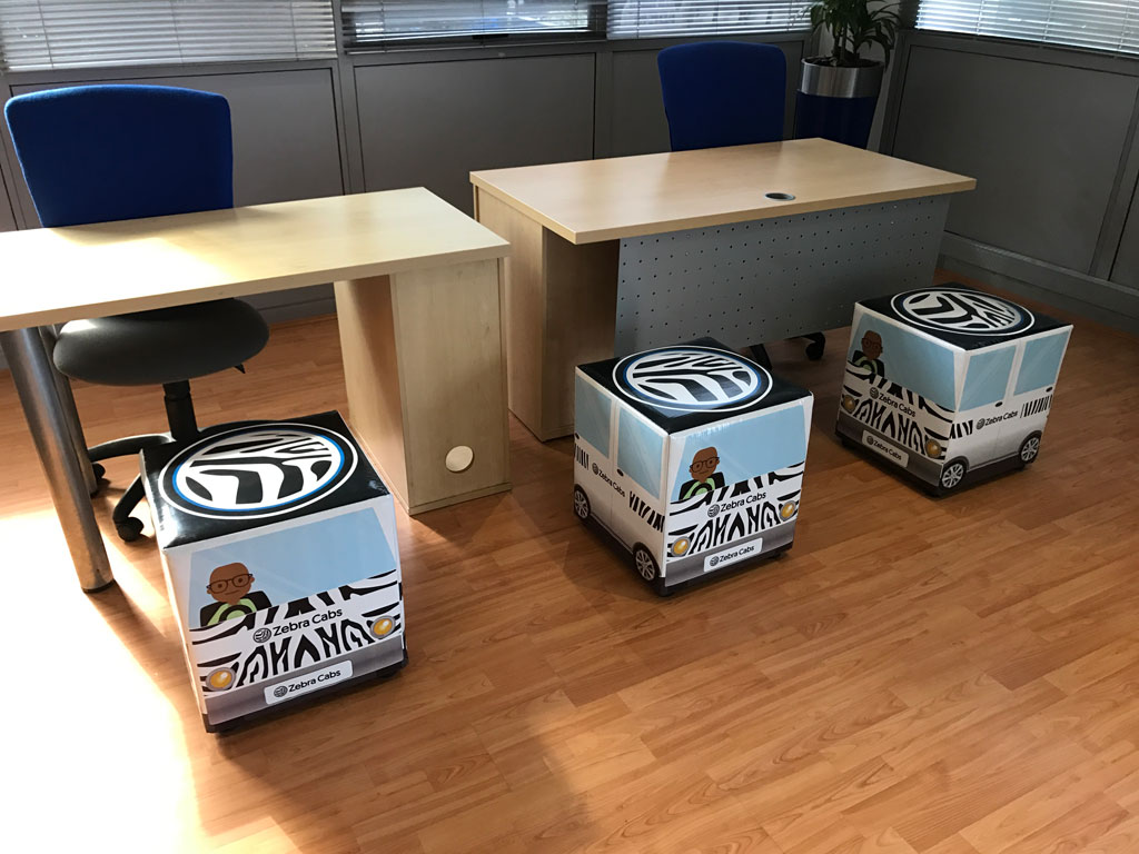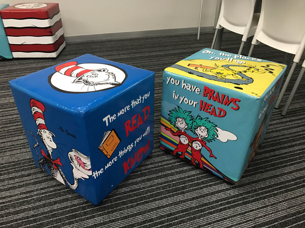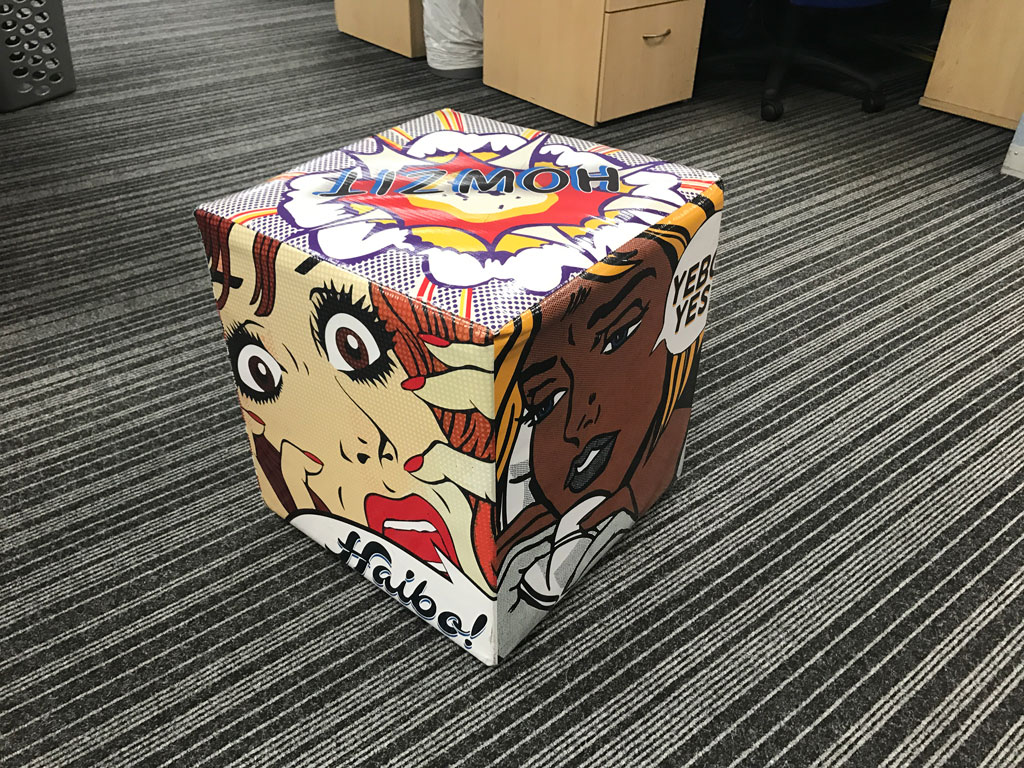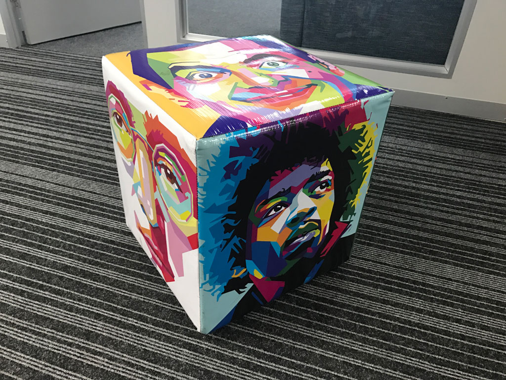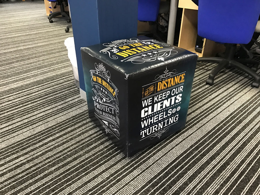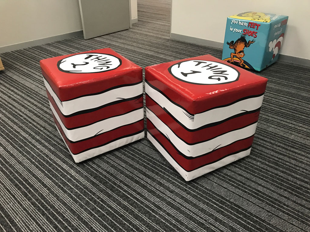 Branded ottomans and canvas prints to make a space your own. Give us a call to see what we can do for you. |